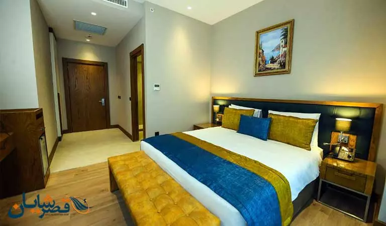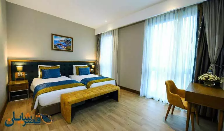 این هتل دارای 136 باب اتاق و سوئیت می باشد. اتااق ها شامل اتاق دبل، تریپل ، سوئیت و ... است و تمامی اتاق ها از امکانات بسیار شیک و مدرن نظیر تختخواب ملافه، تهویه مطبوع ، تلویزیون با کانال های ماهواره ای، سشوار ، کمد لباس و حمام اختصاصی و ... است.