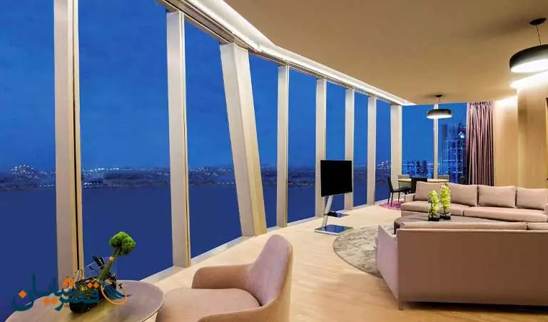 ساختمان هتل در 34 طبقه احداث شده است و دارای 414 باب اتاق و سوئیت است که شامل اتاق دبل دیلاکس، دبل پریمیوم، سوئیت دیلاکس، سوئیت پریمیوم، سوئیت جونیور و ... است.تمامی اتاق ها با دکوراسیون مدرن و کلاسیک طراحی شده است و از امکانات ویژه ای نظیر تلویزیون 48 اینچ با کانال های ماهواره ای ، مبلمان، کمد، یخچال، حمام اختصاصی مجهز به وان و لوازم بهداشتی و آرایشی کامل، سشوار، سیستم سرمایشی، چای ساز و قهوه ساز، اینترنت رایگان و... برخوردار هستند.