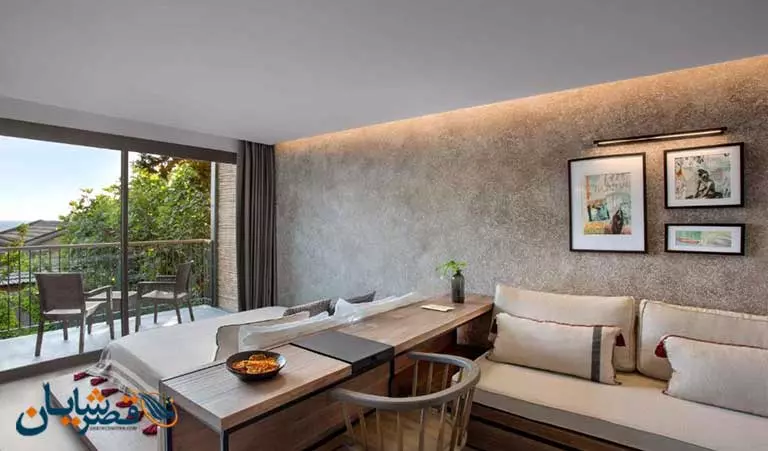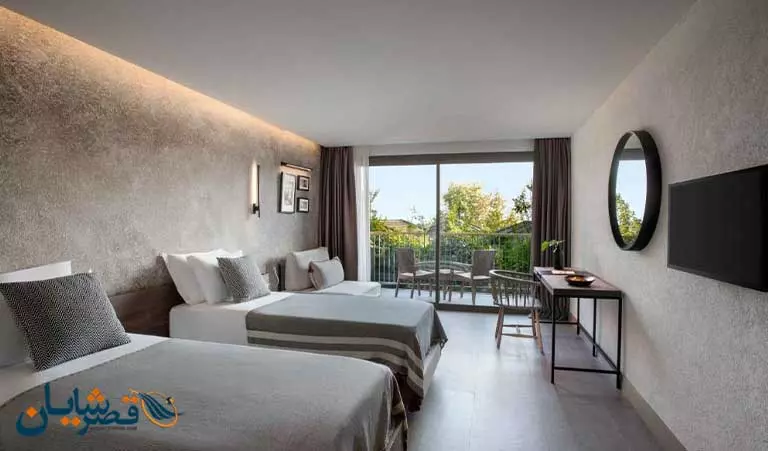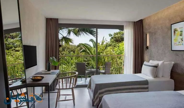 ساختمان هتل 4 طبقه است و دارای 434 باب اتاق و سوئیت می باشد.اتاق ها شامل اتاق کانفرم روم ، پریمیوم کانفرم روم، فمیی روم، پریمیوم فمیلی و... است که این اتاق ها هم رو به گاردن(باغ) و همچنین سی ویو (رو به دریا ) می باشد. تمامی اتاق ها دارای بالکن، تلویزیون با کانال های ماهواره ای، تهویه مرکزی، تلفن مستقیم، صندوق امانات (رایگان)،حمام اختصاصی لوکس با لوازم مجهز( سشوار ،وان و...) است.