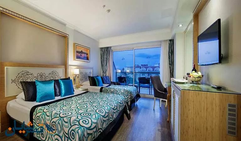 این هتل دارای 9 ساختمان 5 طبقه و 4 ساختمان 3 طبقه و در مجموع دارای 882 باب اتاق و سوئیت است.اتاق ها شامل اتاق دبل استاندارد ، توئین، تریپل، فامیلی روم (اتاق خانواده)، سوئیت ، سوئیت جونیور و ... می باشد که بعضی از اتاق ها دای تراس و بالکن و نمایی از دریا را دارد.تمامی اتاق ها از امکاناتی مثل فرش، تخت دونفره و مبل تخت خواب شو است و همچنین برای کودکان می توان تختخواب کودک و تختخواب اضافی درخواست نمود .همچنین اتاق ها دارای تلفن ، تلویزیون ، رادیو و وای فای (بدون هزینه اضافی) و حمام ها مجهز به دوش ، وان، سشوار و آینه و ... است .