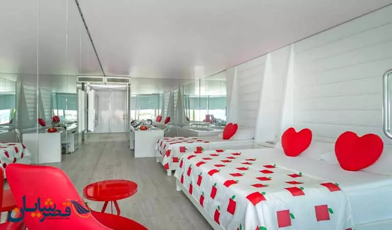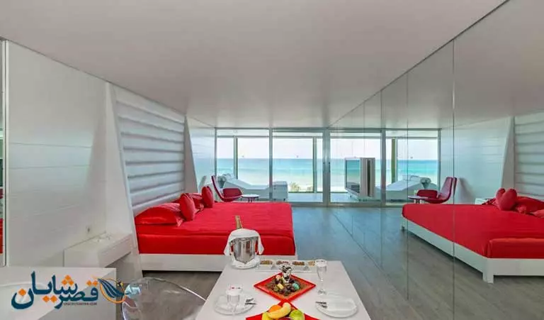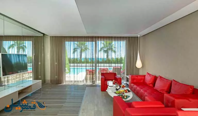 هتل دارای 497 باب اتاق و سوئیت مدرن و شیک است که اتاق ها شامل اتاق توئین، دبل دیلاکس، سوئیت دیزاین، سوئیت کینگ، اتاق هانی مون، ویلا آدم، ویلا حوا و... می باشد. تمامی اتاق ها دارای امکانات بسیار متنوع و بسیار عالی و با کیفیت نظیر تختخواب استاندارد، مبلمان، میز آرایش، کمد لباس،حمام اختصاصی مجهز به دوش و لوازم بهداشتی رایگان، تلویزیون با کانال های ماهواره ای، مینی بار، سیستم تهویه مطبوع، اینترنت رایگان و... برخوردار است.