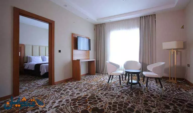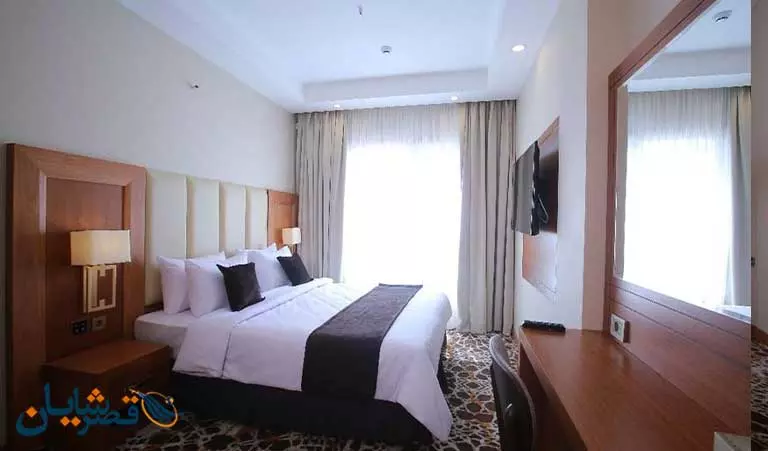 ساختمان این هتل در 8 طبقه و دارای 210 باب اتاق می باشد.اتاق ها شامل اتاق دو تخته ، سه تخته، سوئیت یکخوابه چهار تخته است و از امکانات رفاهی مانند تختخواب ،مبلمان، دراور،کمد لباس، یخچال، تلویزیون، چای ساز، سیستم گرمایش و سرمایش و ... برخوردار است.