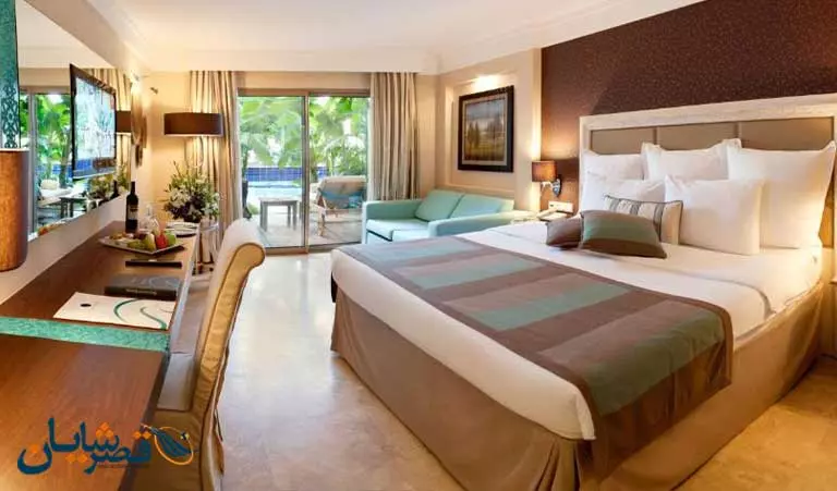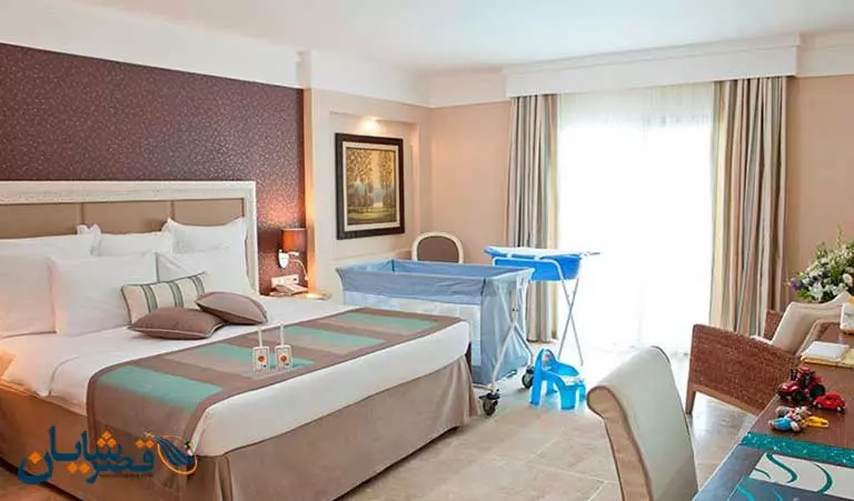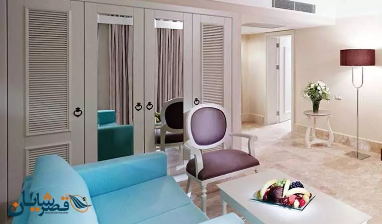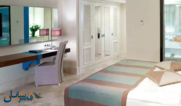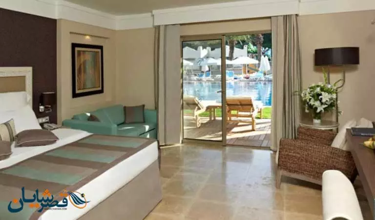 هتل دارای 4 طبقه و 268 باب اتاق و سوئیت است که اتاق ها شامل اتاق توئین و دبل گاردن (رو به باغ)، توئین و دبل سی ویو ( رو به دریا)، فمیلی سوئیت، تراس سوئیت (سوئیت تراس دار) و ... می باشد.تمای اتاق ها از امکانات بسیار عالی و مدرن نظیر بالکن، تهویه مرکزی، تلفن مستقیم، صندوق امانات (رایگان)، تلویزیون ال ای دی با شبکه های ماهواره ای، حمام اختصاصی با لوازم( سشوار، وان و ... )، قهوه ساز ، چای ساز و ...بر خوردار است.