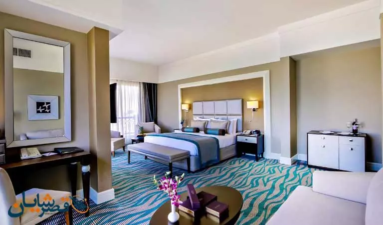 هتل دارای 650 باب اتاق و سوئیت متنوع است که اتاق ها مدرن و شیک طراحی شده است و شامل اتاق دیلاکس گاردن،جونیور سوئیت،پریمیوم روم،کلاسیک روم،فمیلی سوئیت،سوئیت تری کینگ،سوئیت سنیور، فمیلی روم و ... است.تمامی اتاق ها از امکاناتی خوب نظیر تلویزیون با کانال های ماهواره ای، تخت خواب های راحت و استاندارد، حمام اختصاصی به همراه سشوار و حوله و لوازم بهداشتی، یخچال،مینی بار، سیستم تهویه مطبوع ، اینترنت رایگان و ... برخوردار است.همچنین برخی از اتاق ها دارای تراس نیز می باشد.